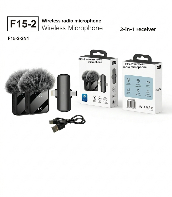 Designed for convenience, the F15-2 offers a plug-and-play setup, meaning no apps or complicated pairing are required. Simply connect the receiver to your device, and the microphones automatically sync. Many versions come with a multi-interface receiver (Type-C, Lightning, and 3.5mm), making it compatible with smartphones, cameras, tablets, and laptops.