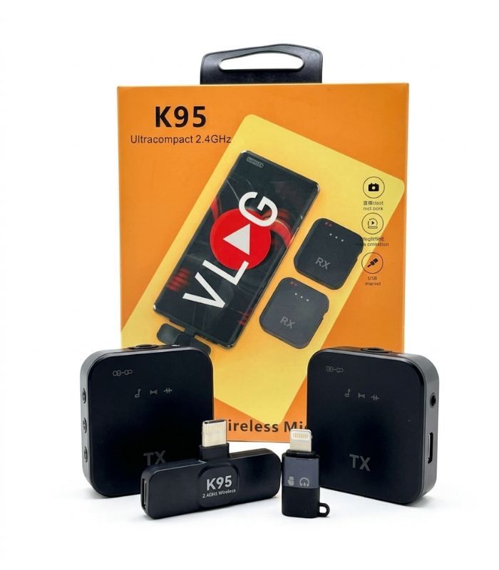 The K95 is designed for ease of use with a plug-and-play setup, meaning no apps or complicated pairing are required—just connect the receiver, and it automatically links to the microphone. Many versions include a 3-in-1 receiver compatible with Type-C, Lightning, and 3.5mm devices, making it suitable for smartphones, cameras, laptops, and tablets.