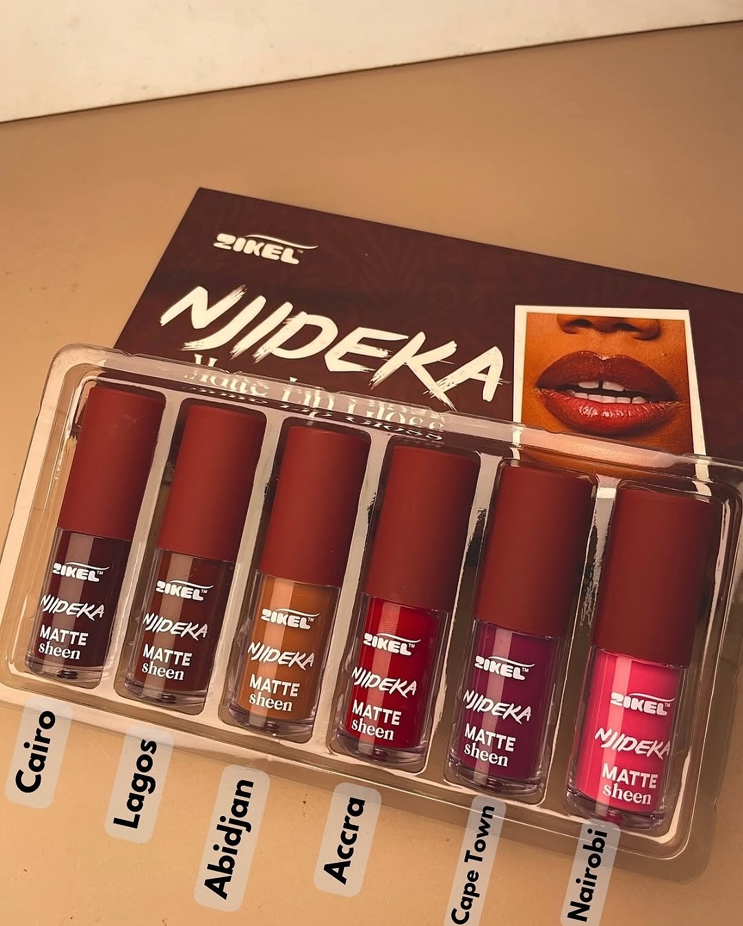 Perfect for day-to-night wear, Zikel Njideka Matte Sheen lipstain delivers long-lasting color, modern matte elegance, and a touch of shine that keeps your lips looking bold, confident, and beautifully styled.